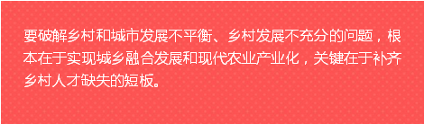 要破解乡村和城市发展不平衡、乡村发展不充分的问题,根本在于实现城乡融合发展和现代农业产业化,关键在于补齐乡村人才缺失的短板。实施乡村振兴战略,关键是做好乡村本土人才的培养和开发,同时要创新机制,鼓励和引导人才合理流向乡村,为农业农村经济社会发展提供支持和帮助。
