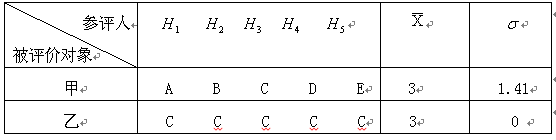 在两个以上被评价对象得分平均值相同甚至于相近的情况下,作为判断被评价对象优劣程度的指标,离散度被应用于人事决策。例如,五个参评人按五个等级(A、B、C、D、E),对两个被评价对象(甲、乙)进行评价,评价结果见表1。