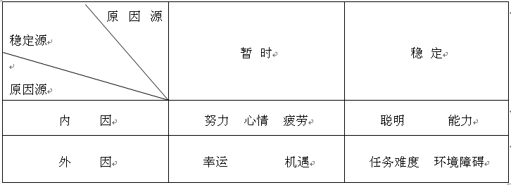 如图所示,维纳把努力、心情、疲劳、聪明和能力看作是影响个人发展的内因,把幸运、机遇、任务难度和环境障碍看作是影响个人发展的外因。从稳定性来讲,维纳又把努力、心情、疲劳、幸运和机遇看作是暂时性原因,把聪明、能力、任务难度和环境障碍看作是稳定性原因。